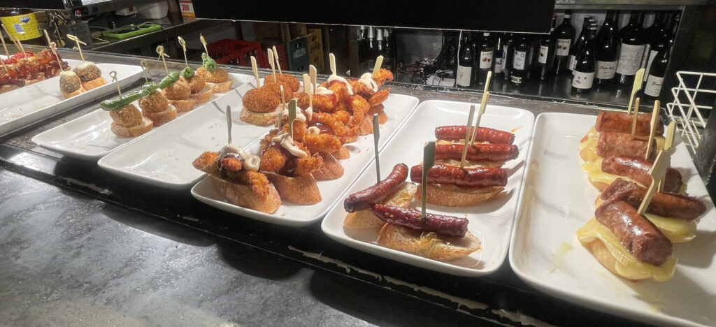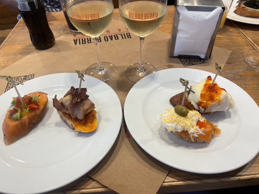 ▼ピンチョス1人2個とドリンク1杯はツアーに含まれています。ピンチョスを各々選び、白ワインとともにいただきました。ちなみに、少しずつ値段が違うものの、高いものでも追加料金はかかりません。